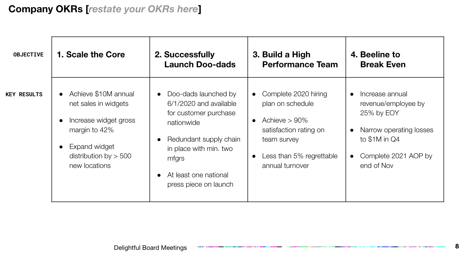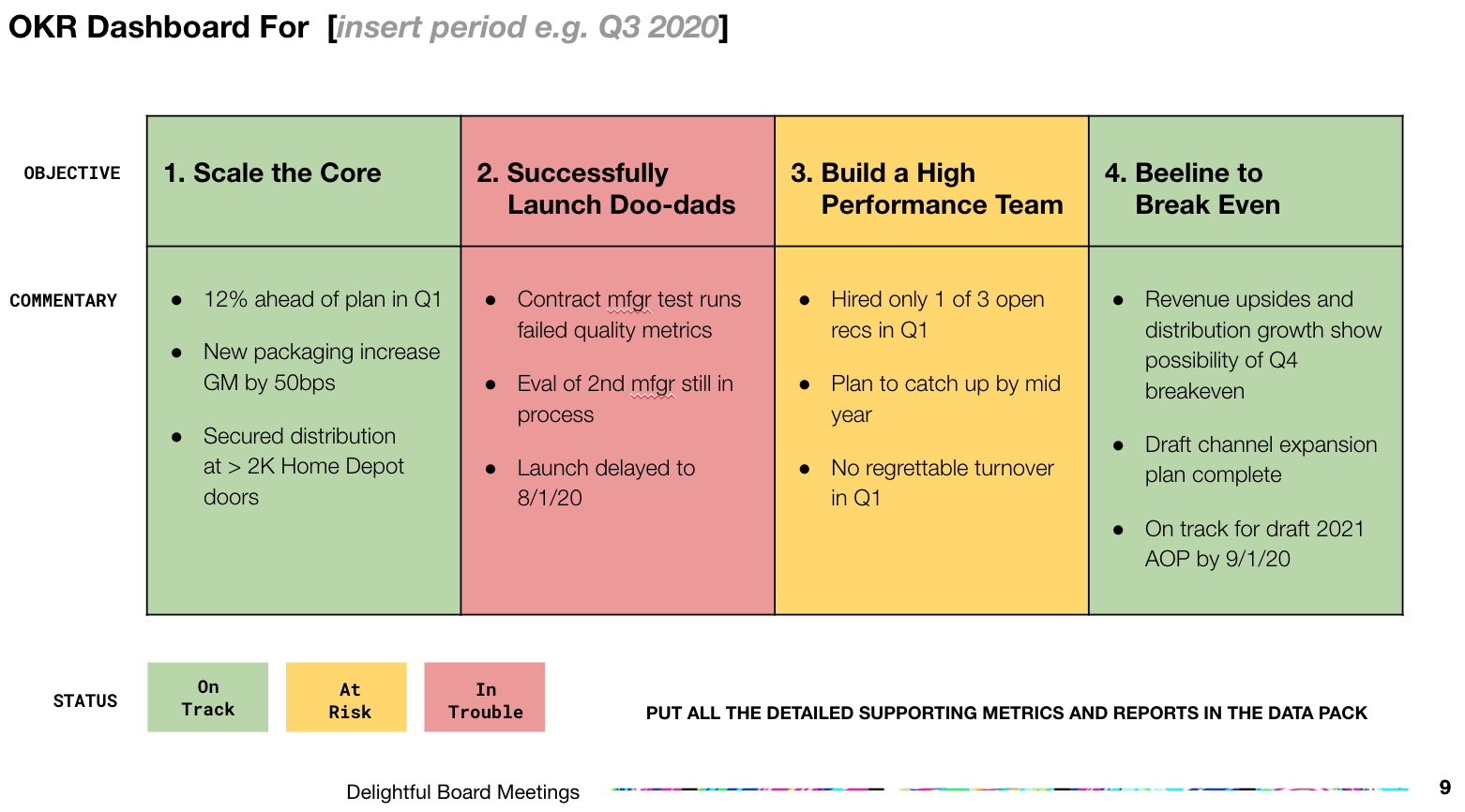 Do your best to summarize the company state of the union in one slide for the “big picture” including wins, misses, and board needs. For the OKR update, start with a restatement of the company-wide OKRs, then follow that with a dashboard of how we’re doing on those year-to-date and commentary and color for the BOD to understand why.