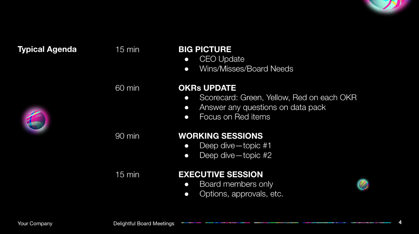 With the bulk of your metrics reporting culled into your data pack, your board deck can now focus on the critical few strategic issues the company is facing. We recommend building your board meeting agenda around company OKRs, where you can use a green/yellow/red scorecard as a simple gauge of performance. [For a lean, mean effective guide to setting company OKRs, read our series here.] For a typical three hour board meeting, we recommend the following time allocation: