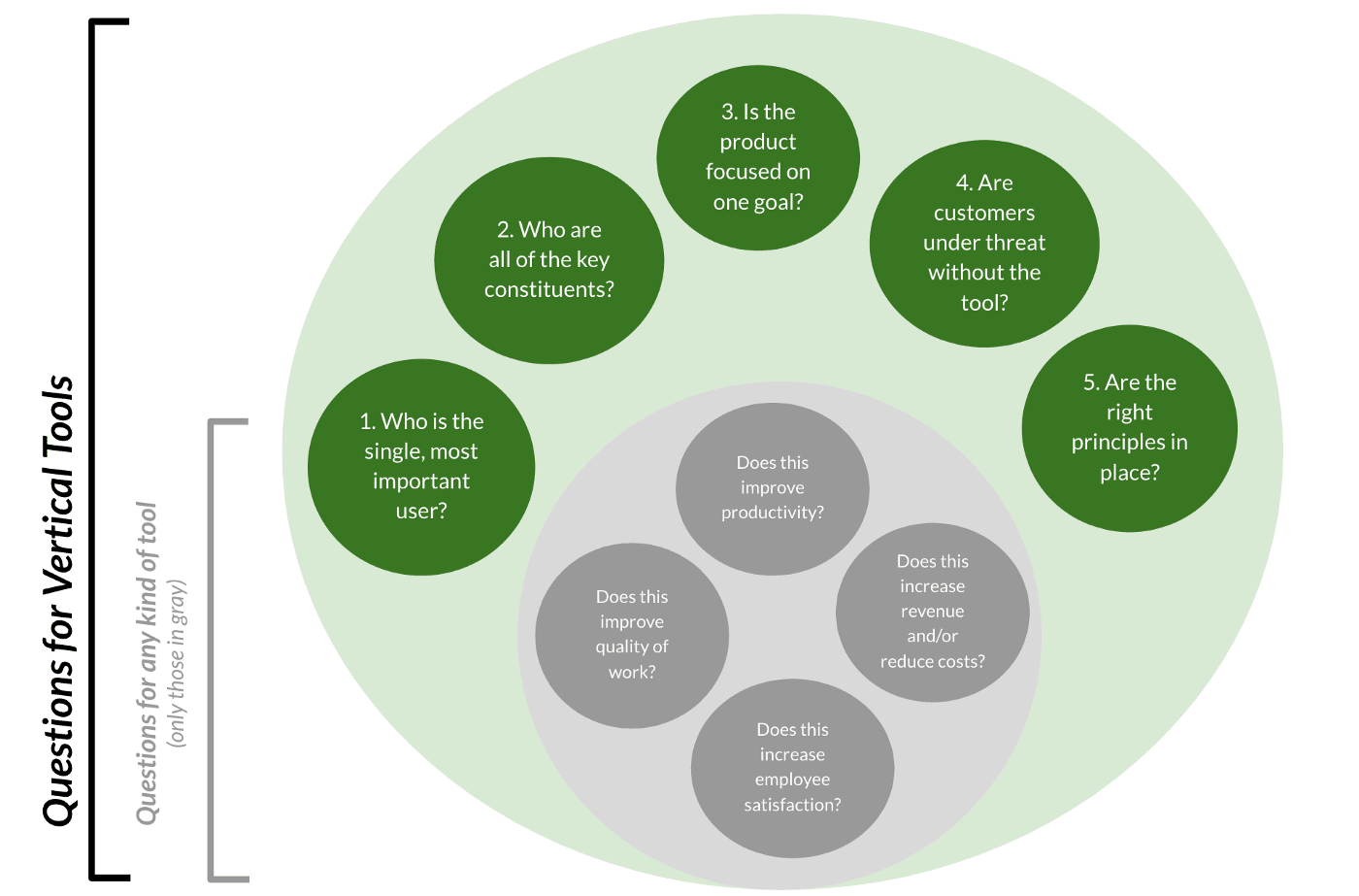 Over the years, I have both built and used all manner of these tools. I’ve been trained to consider multiple questions when evaluating them, which can apply broadly to practically any industry (shown in gray). When we shift our focus to uncover vertical work opportunities, however, there are additional questions to reflect on (shown in green):
