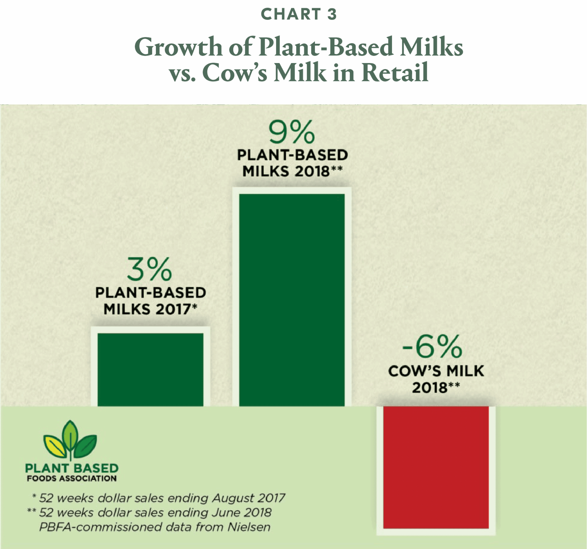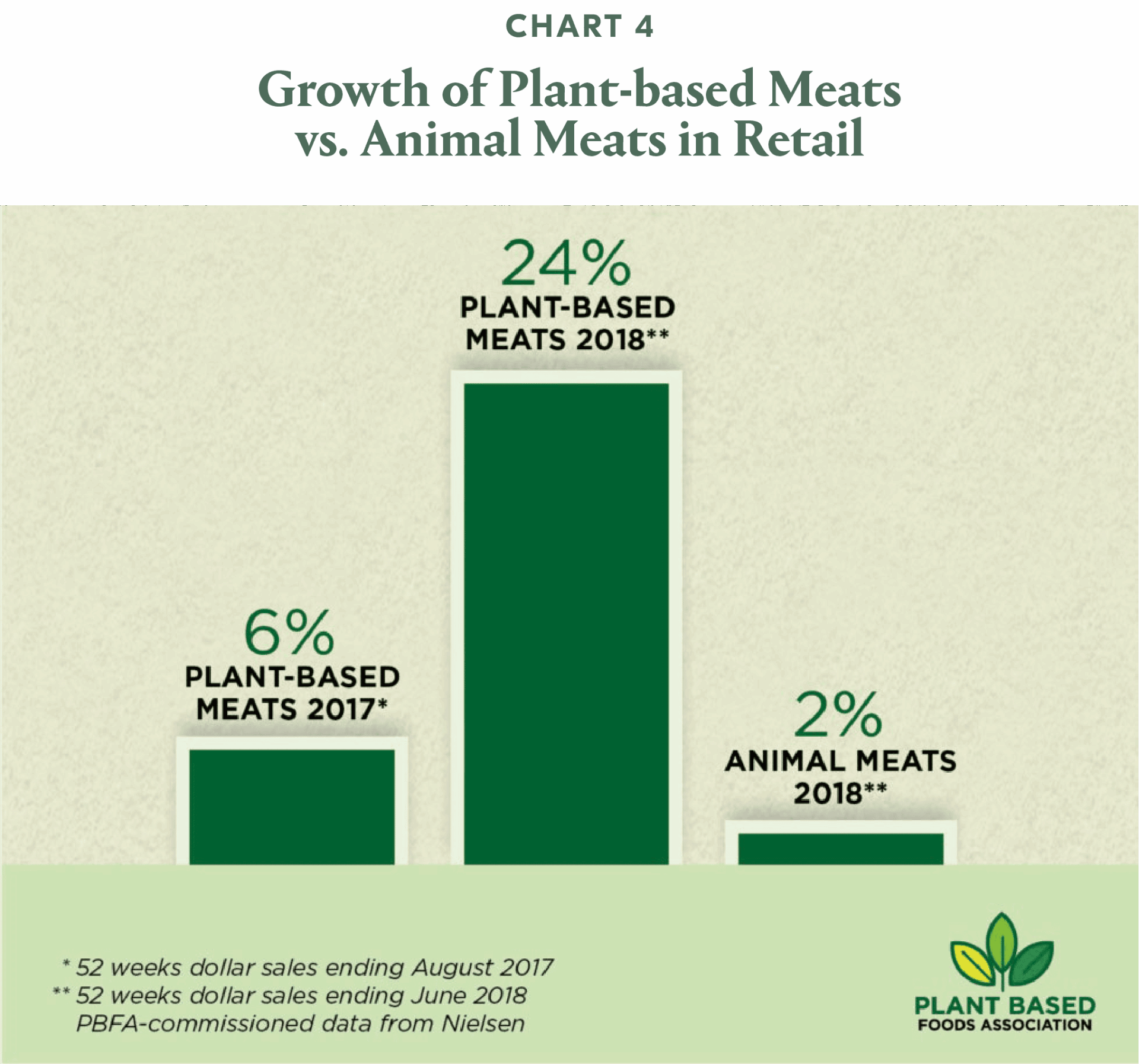 Nielsen also reported rapid growth in the plant meat category, with delicious alternatives like the Beyond Burger now available in the meat section of supermarkets across the nation. In the last twelve months plant-based meats have grown sales 12X faster than animal meat, and I predict we’re going to see that growth accelerate further in 2019.