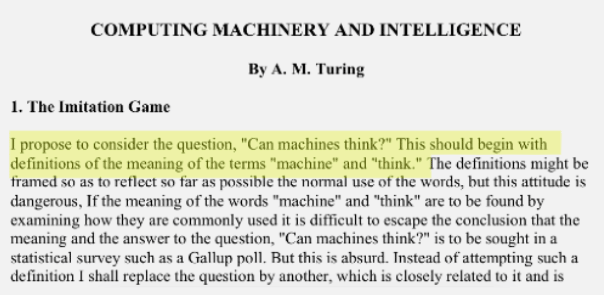 Alan Turing was already asking these epistemological (and existential) questions in 1950—in the very first sentence of his groundbreaking paper Computing Machinery and Intelligence, no less: